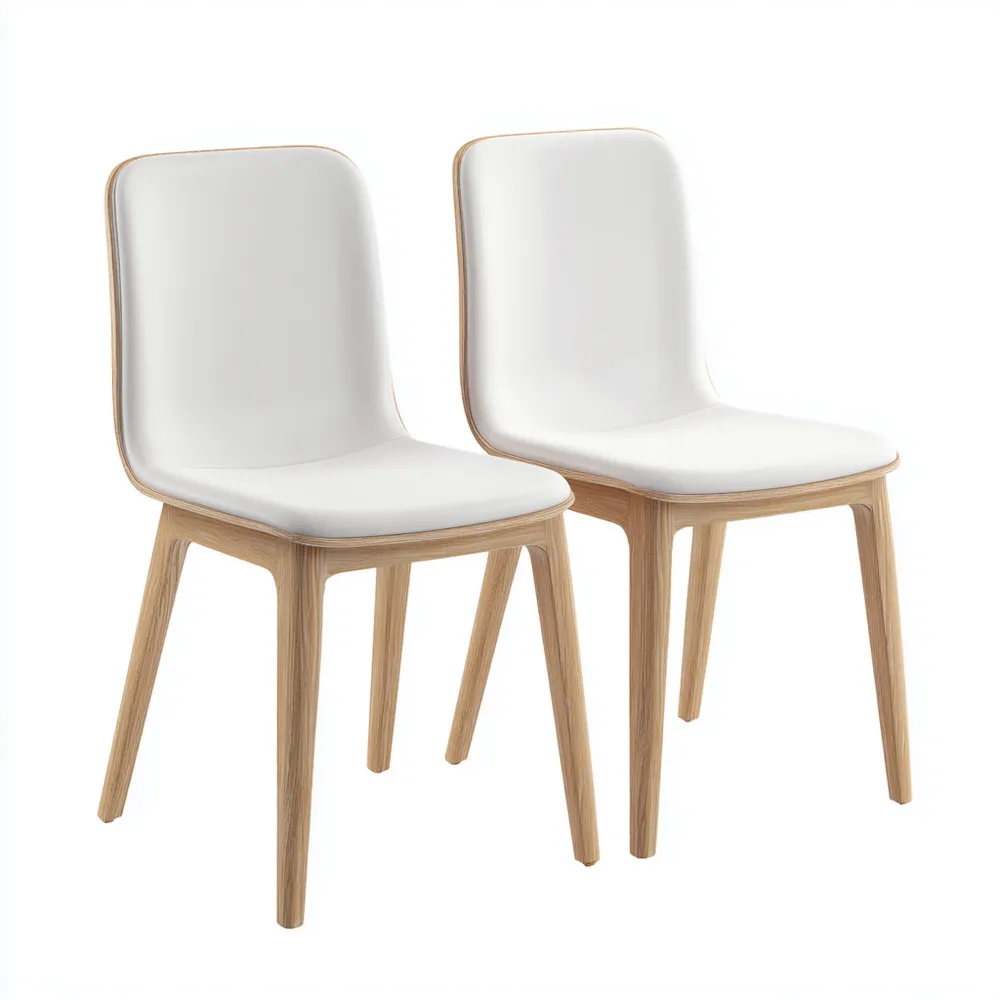 Material und VerarbeitungDie Stühle bestehen aus hochwertigem Holz und sind mit weißem Kunstleder bezogen. Die handwerkliche Verarbeitung garantiert Langlebigkeit und Komfort.